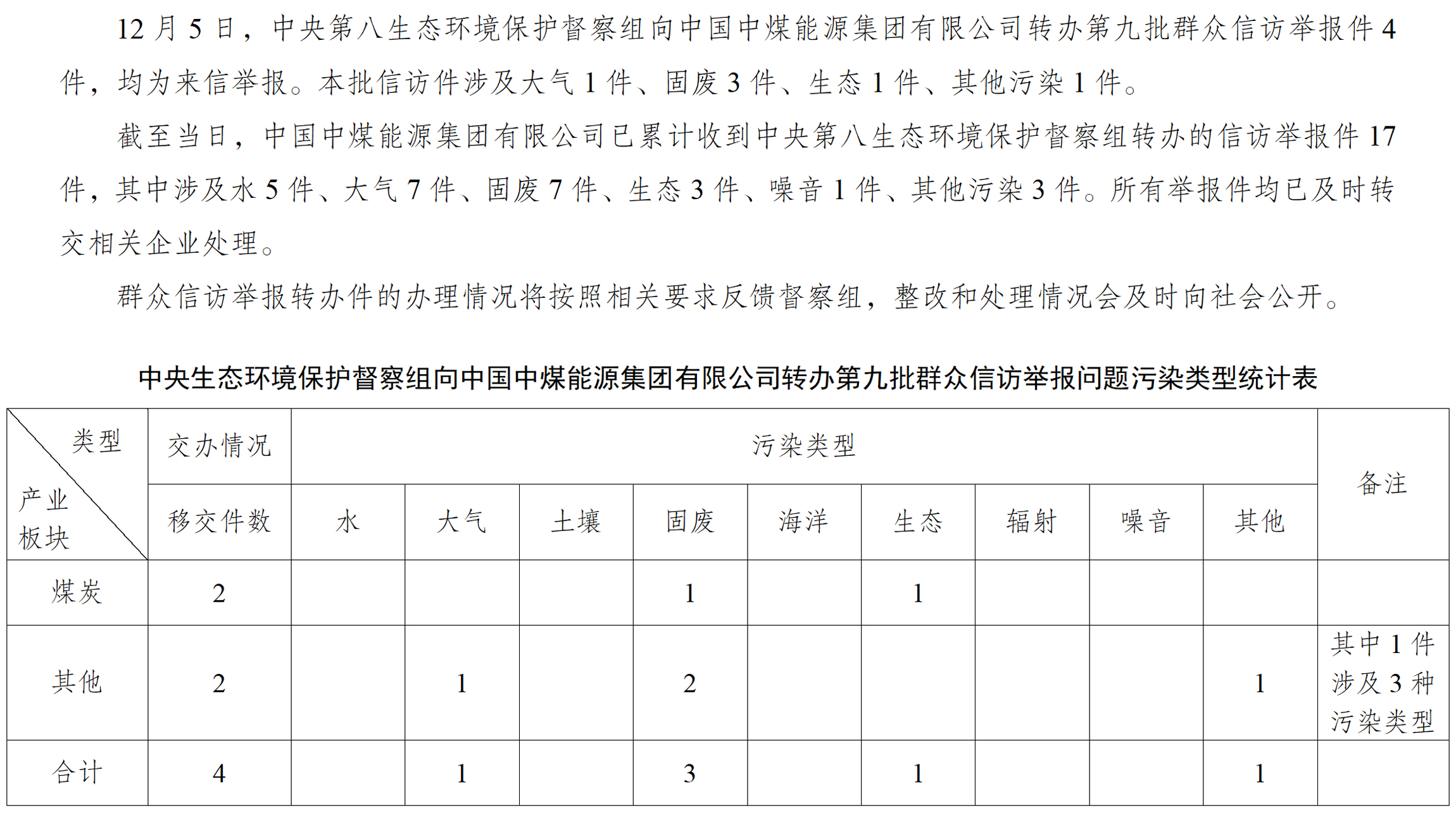 中央第八生態環境保護督察組向中國中煤能源集團有限公司轉辦第九批群眾信訪舉報件