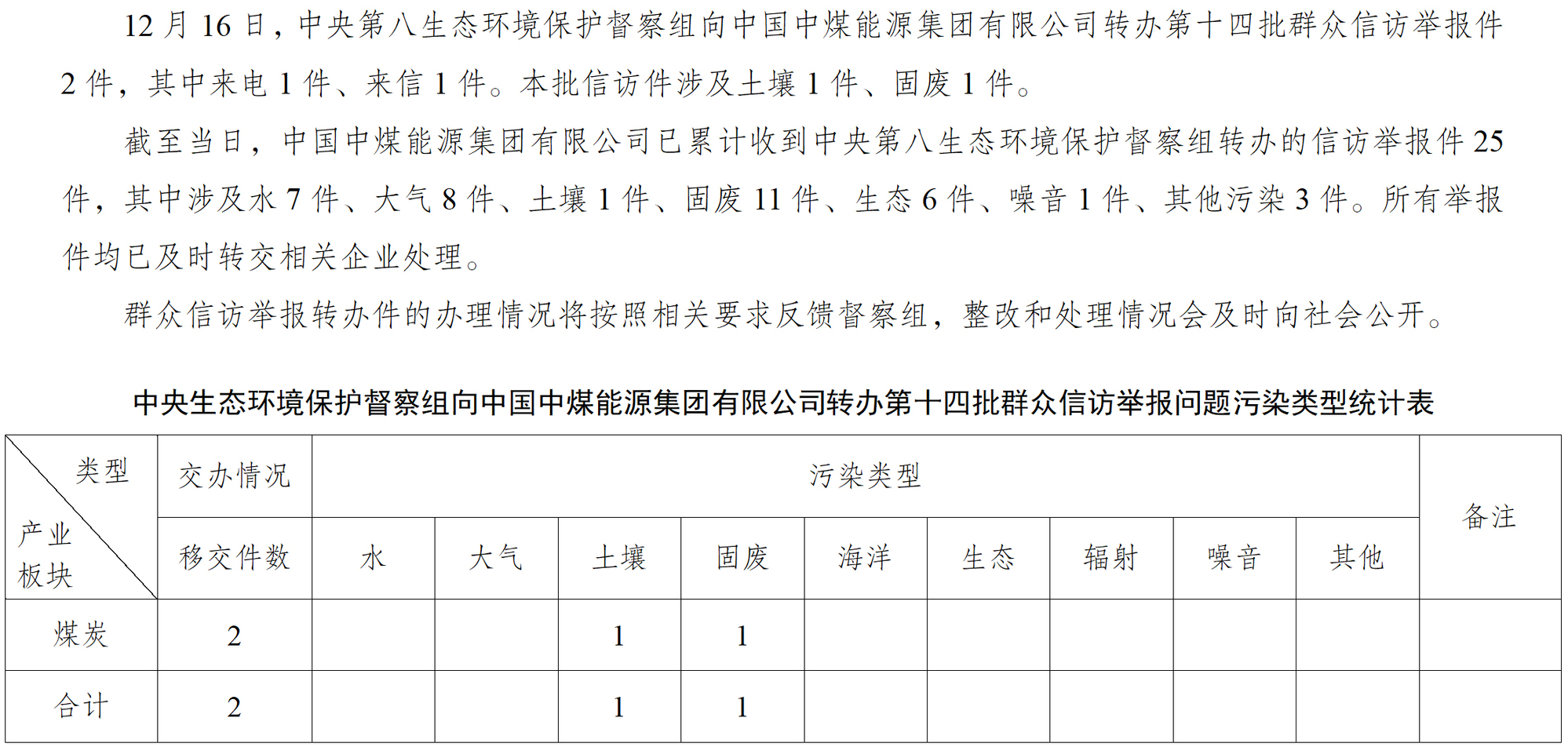 中央第八生態(tài)環(huán)境保護(hù)督察組向中國(guó)中煤能源集團(tuán)有限公司轉(zhuǎn)辦第十四批群眾信訪舉報(bào)件